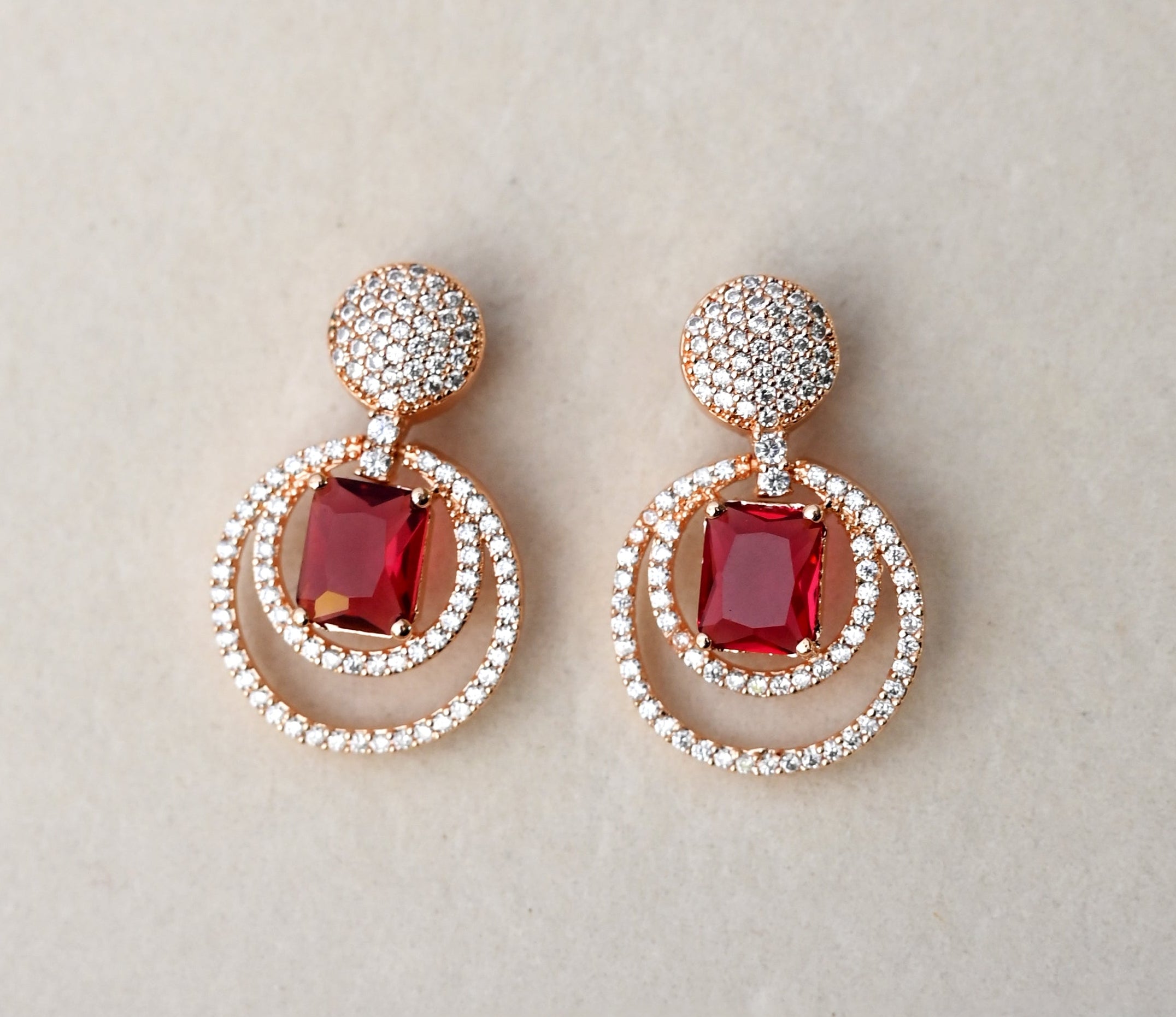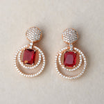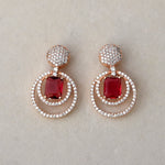Featuring a striking ruby-red centerpiece embraced by twin rose-gold halos studded with brilliant stones, this design radiates opulence from every angle. The pavé-set top adds an extra touch of sparkle, creating a seamless flow of luxury from stud to drop. Perfect for weddings, soirées, and every moment you wish to make unforgettable, these earrings are crafted to elevate your presence with bold sophistication and timeless allure.