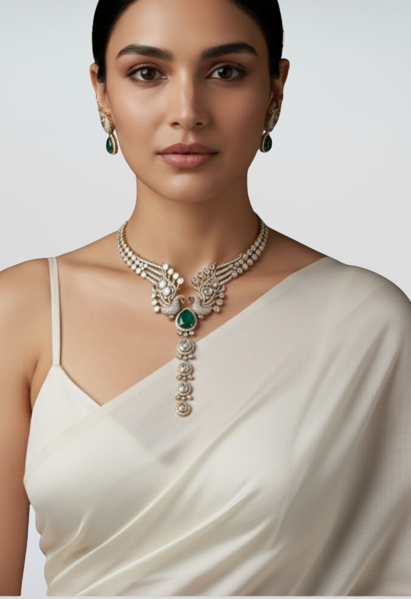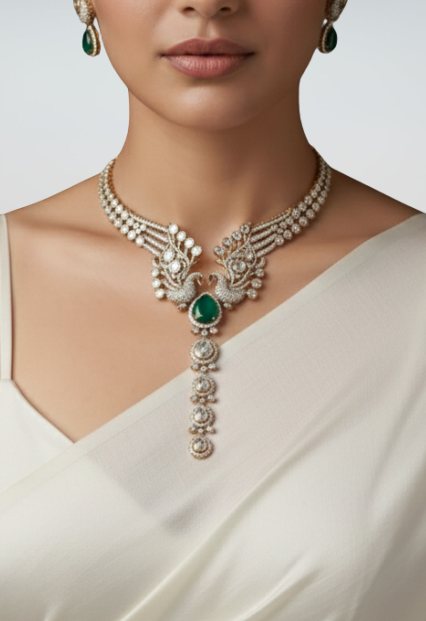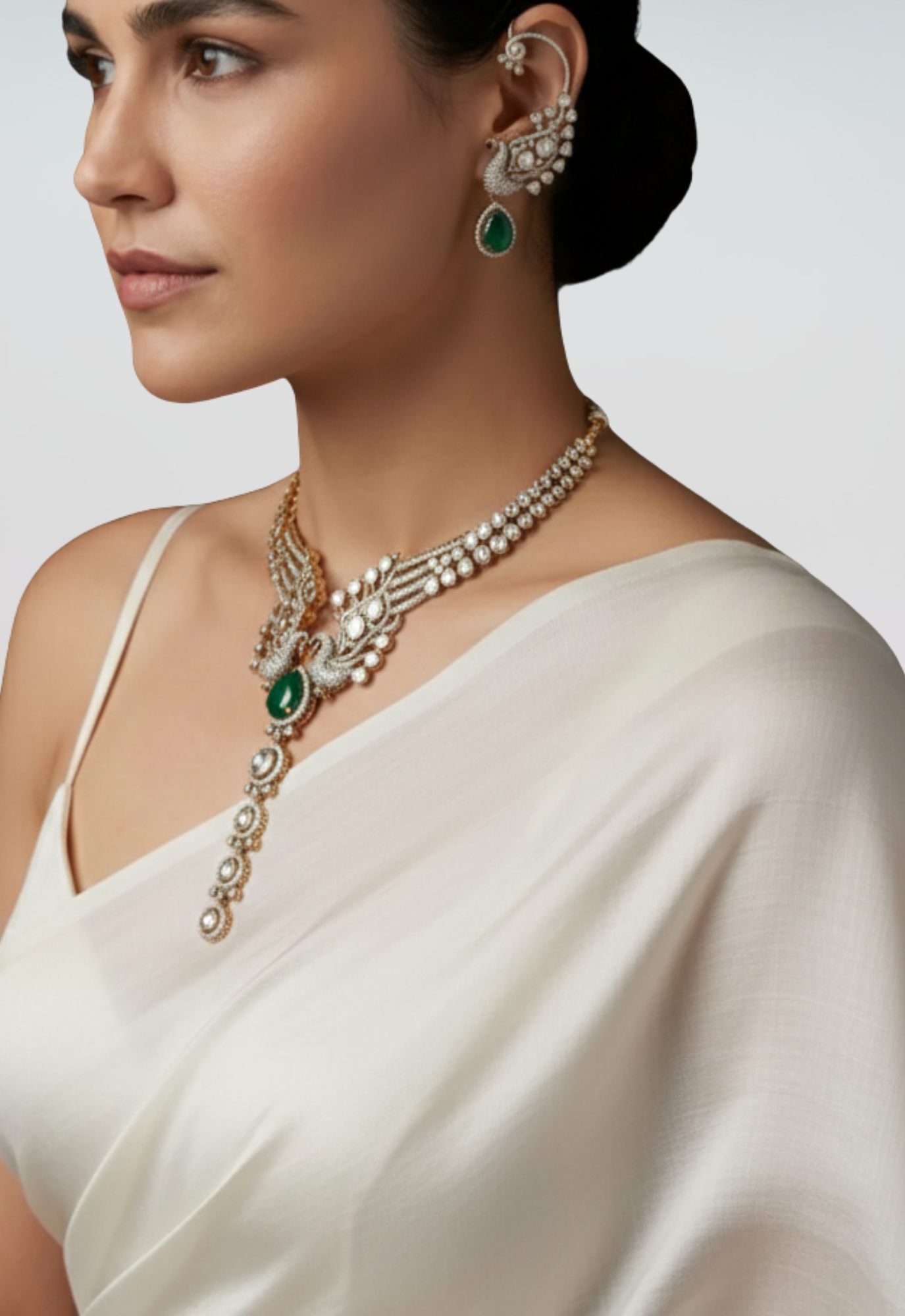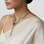 An exquisite choker necklace featuring layered pearl strands, intricate kundan detailing, and a graceful emerald drop centre. Paired with statement ear cuffs accented with emerald-toned drops, this set blends royal elegance with contemporary finesse.