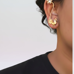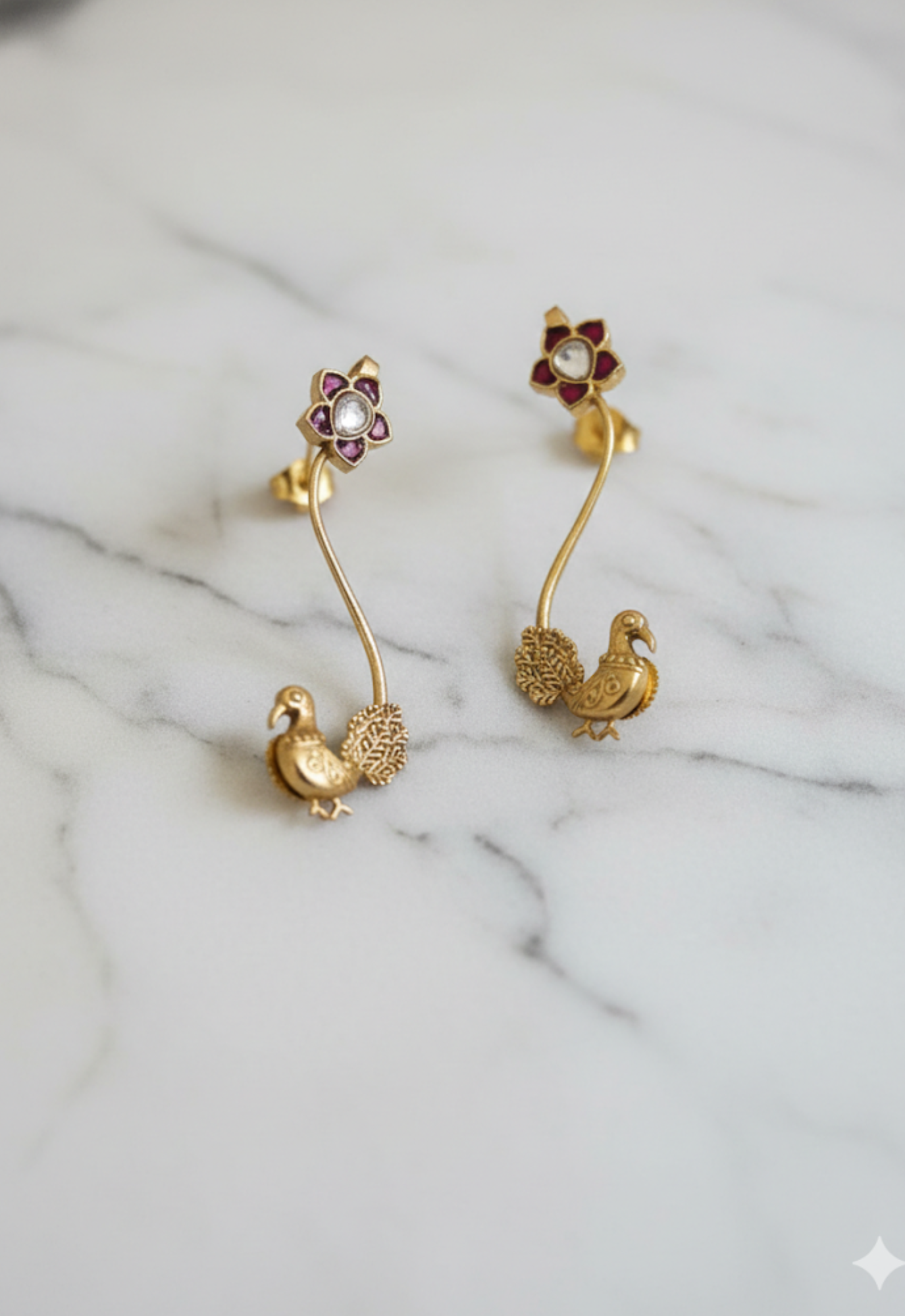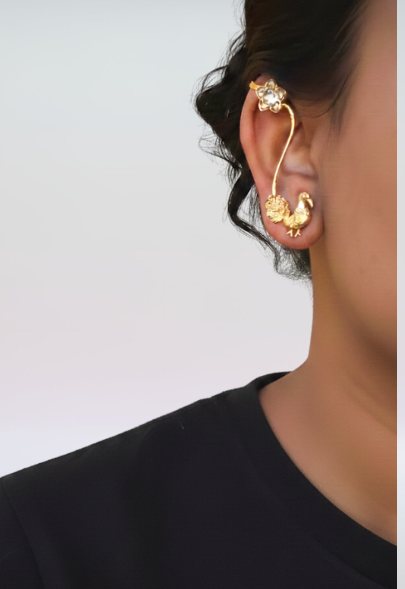 A graceful ear cuff featuring a delicate floral kundan stud connected to a sculpted peacock motif, finished in a rich gold tone. Designed to trace the natural curve of the ear, this piece blends traditional symbolism with contemporary elegance.