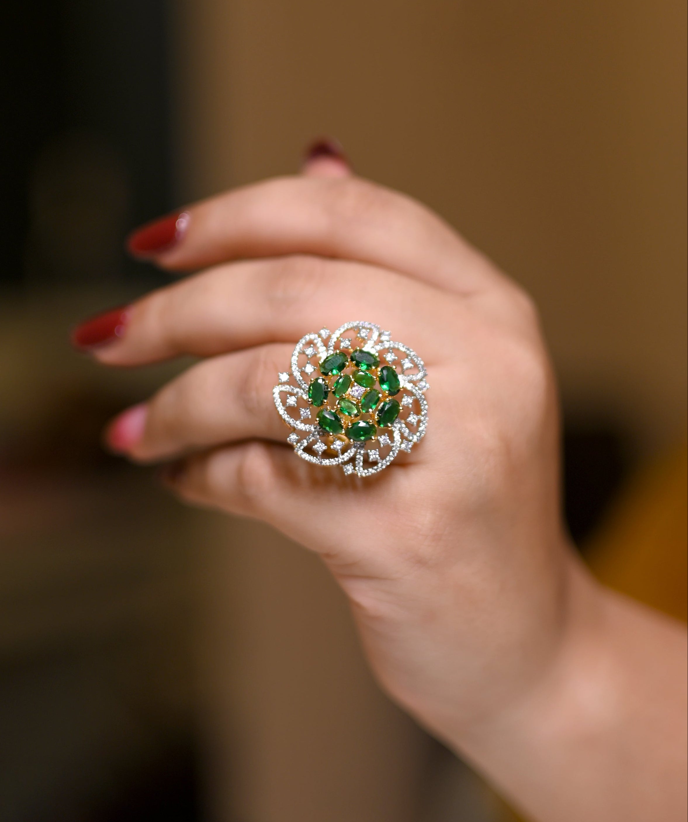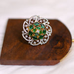 A regal fusion of elegance and artistry — featuring rich emerald-toned stones arranged in a blooming floral motif, embraced by a sparkling diamond halo. This statement ring reflects royal charm and modern sophistication, perfect for brides, festive celebrations, and anyone who loves to shine with timeless grace.