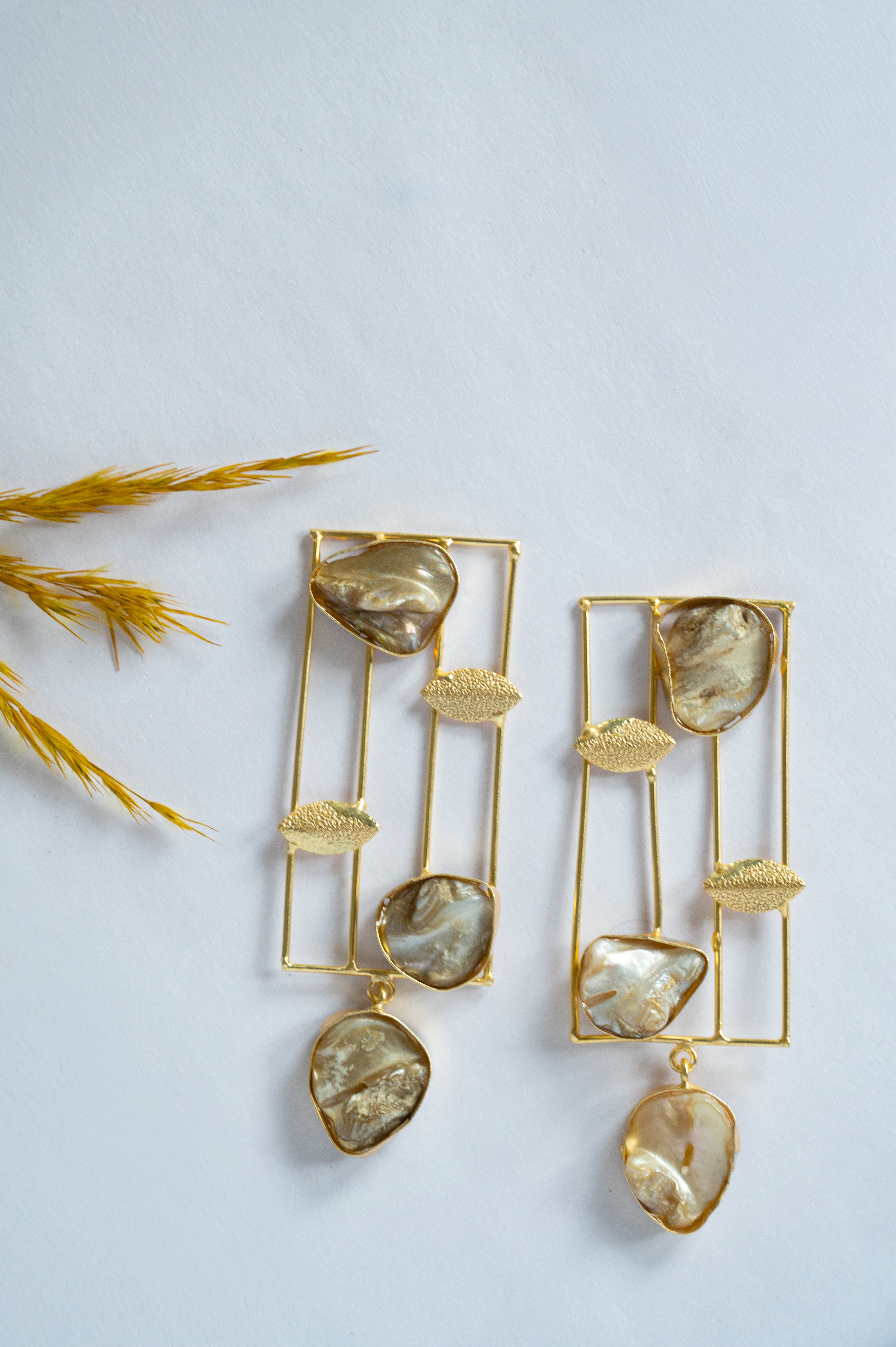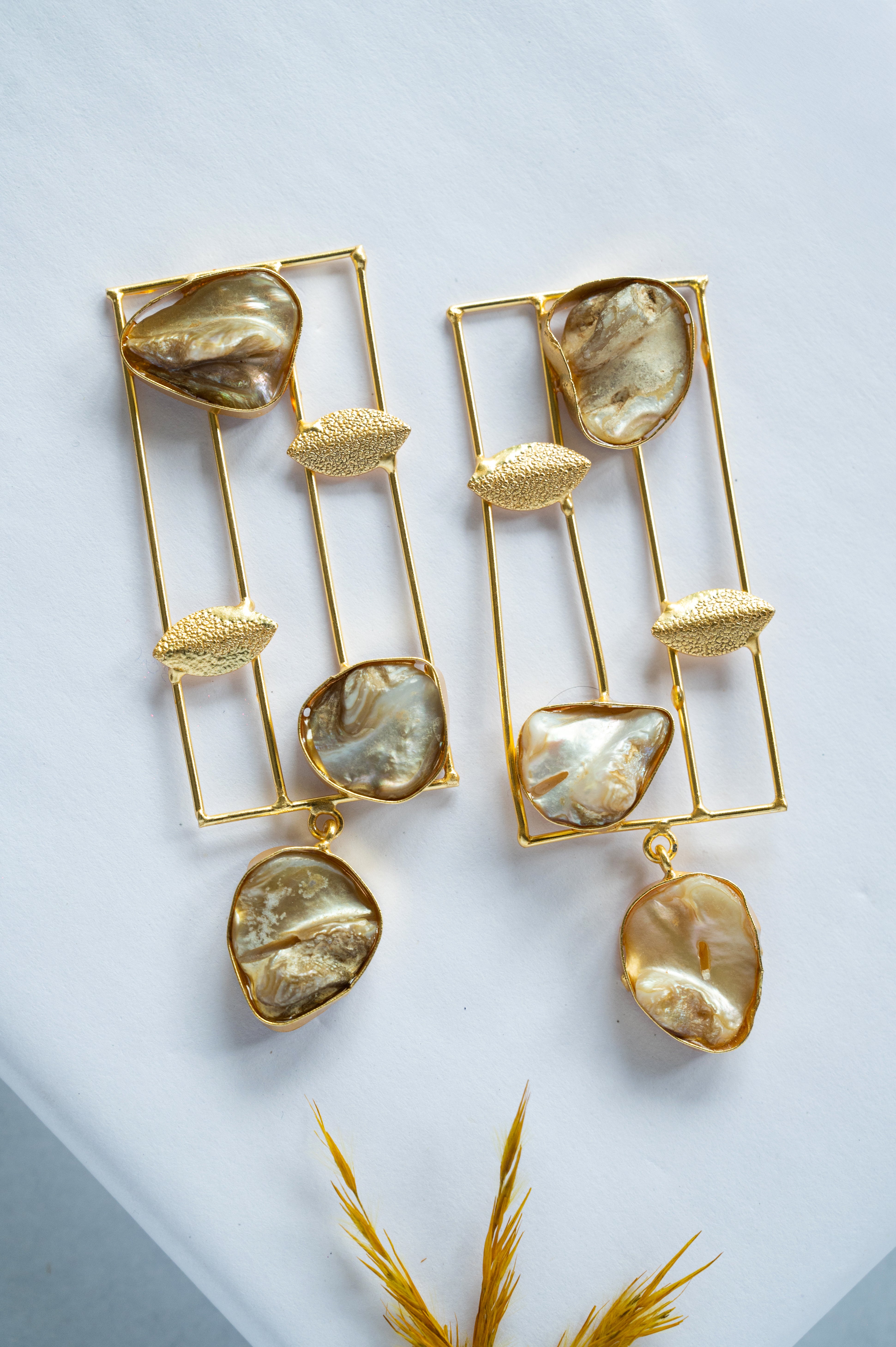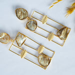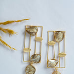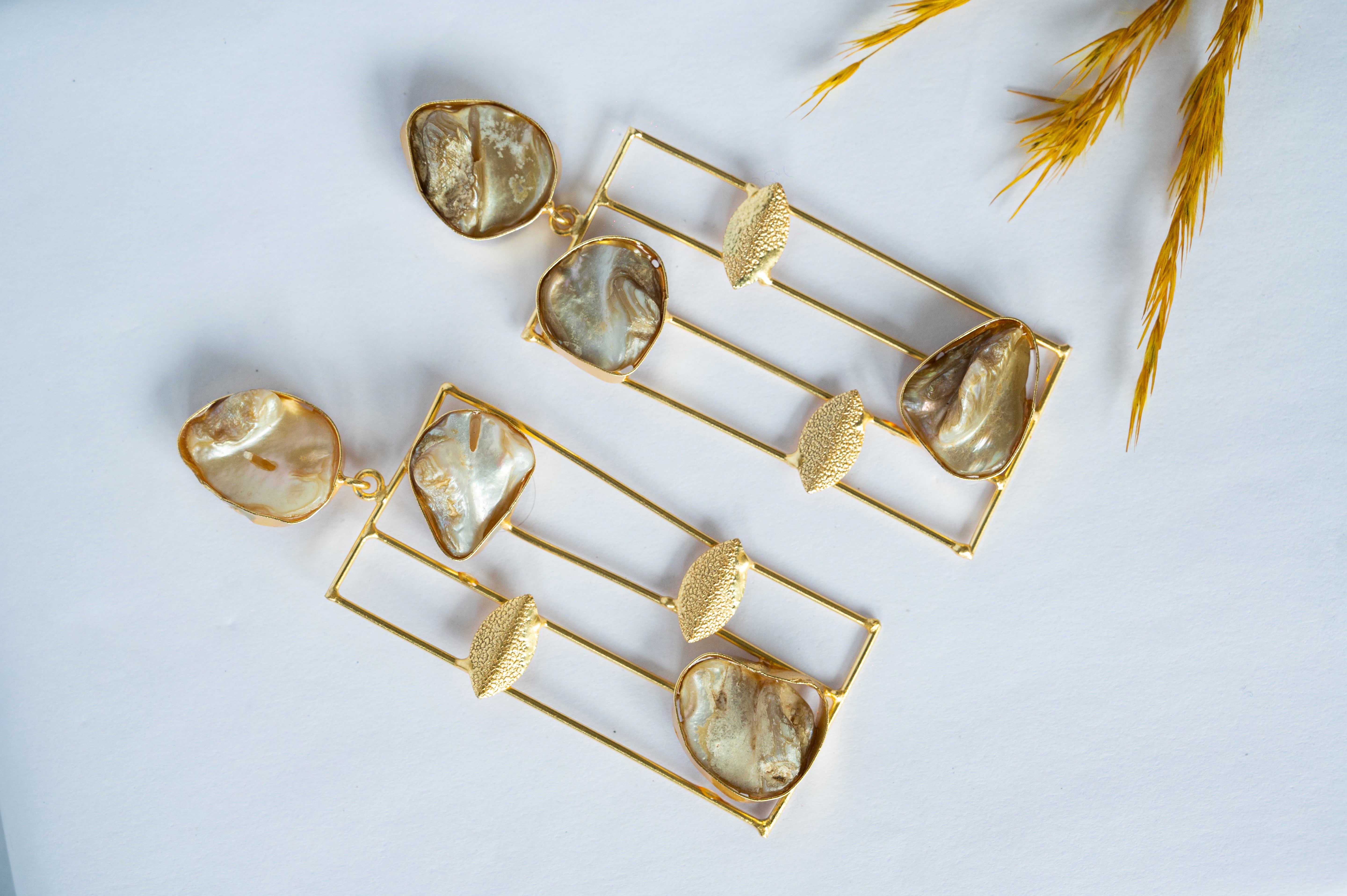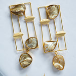Bold and artistic, these Geometric Pearl Drop Earrings feature raw-cut shell pearls set in sleek golden grids. A perfect blend of natural charm and modern minimalism, they make a striking statement.